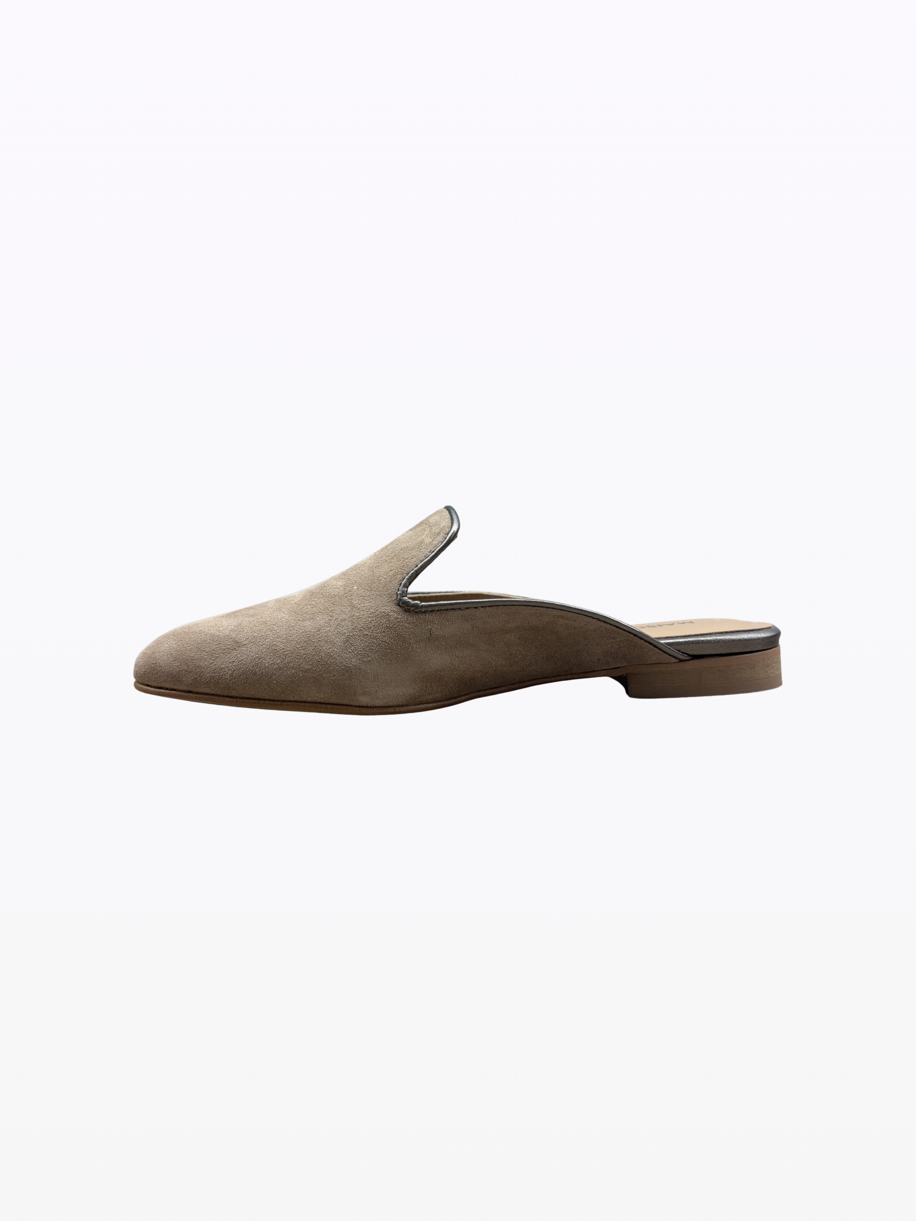 Mules en daim italien. Doublure en cuir. Talon de 2 cm. Semelle antidérapante en cuir.
