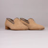 Timeless college moccasin. For incredible flexibility and comfort, we have chosen a very soft suede calf known for its resistance to bad weather. The foot slides in and the effect “like a glove” is incredible. Ideal worn barefoot. 4 seasons leather sole.