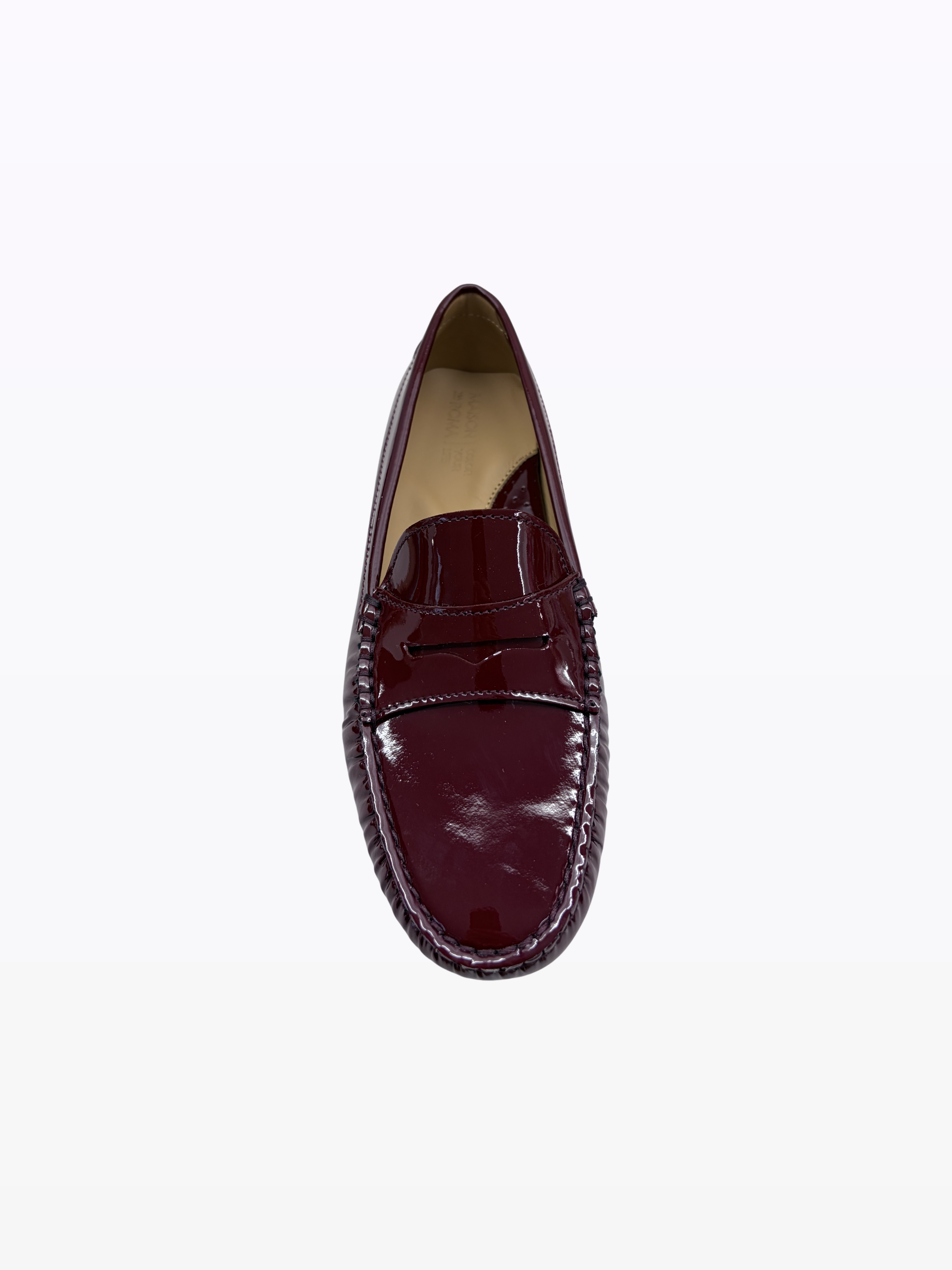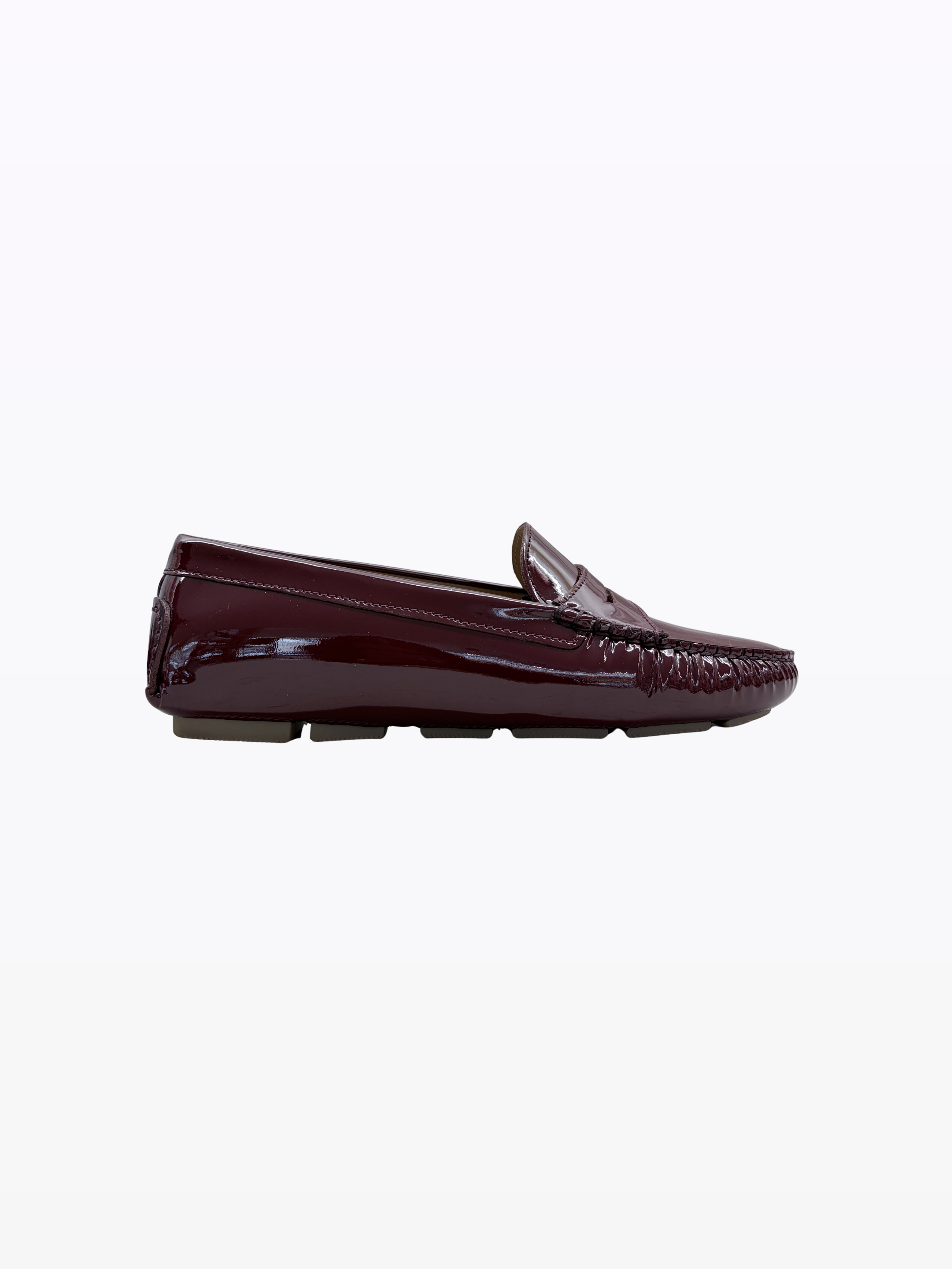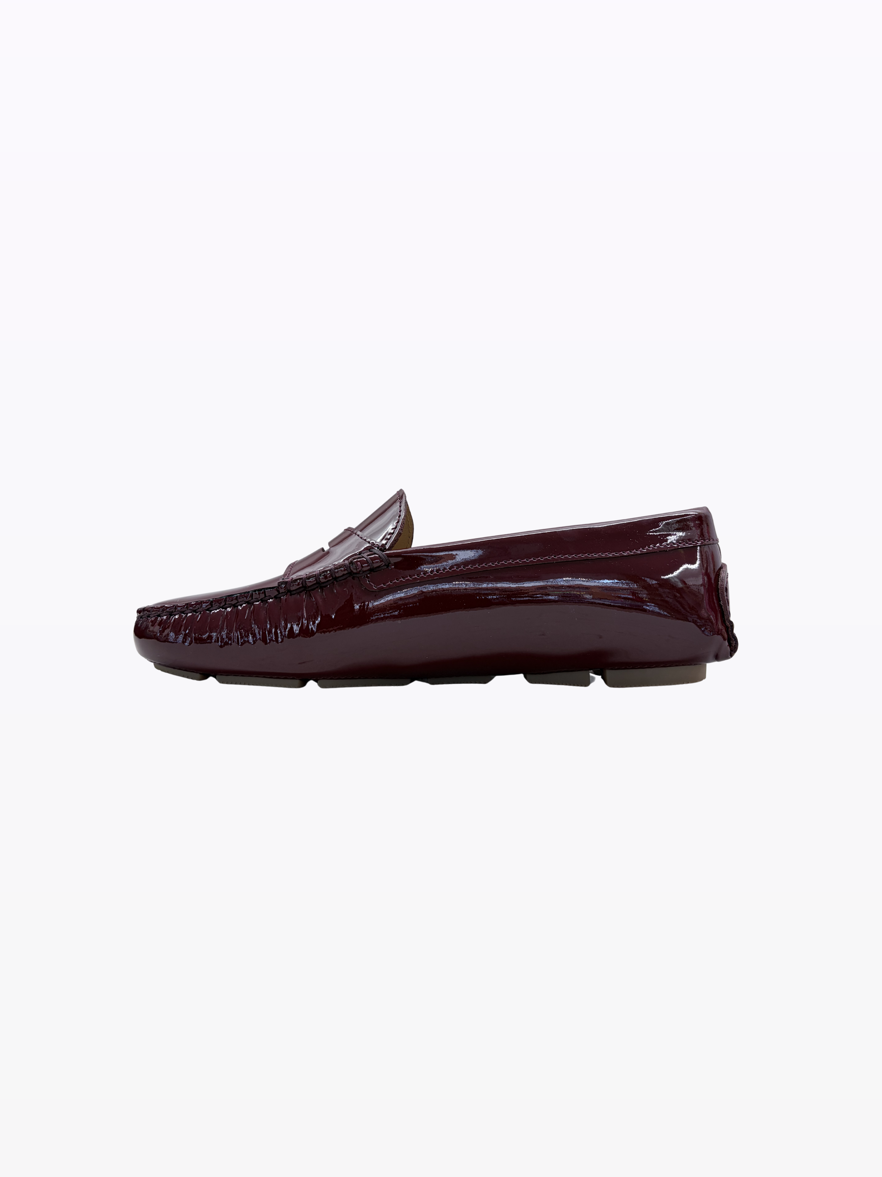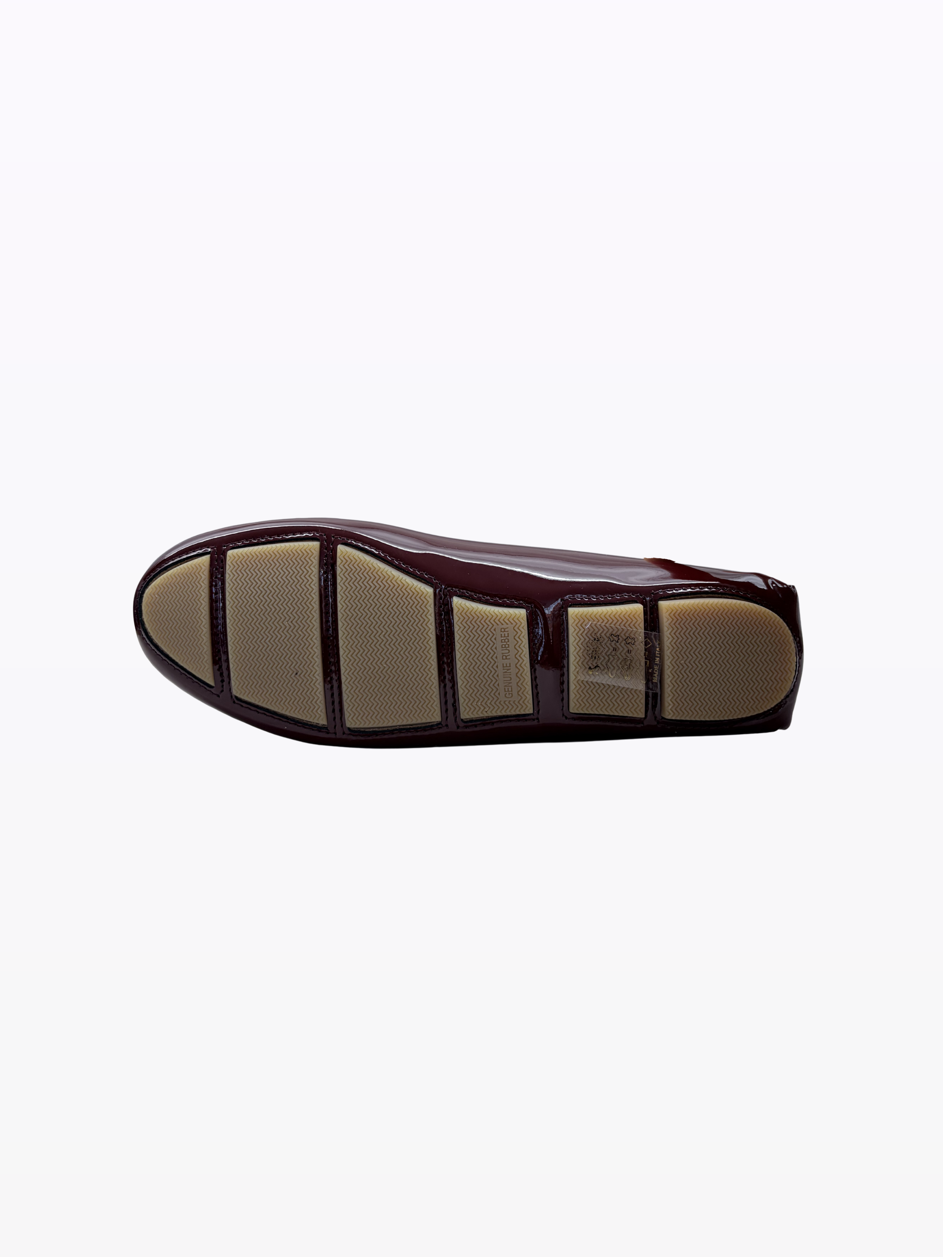 Moccasin carshoes with rubber sole and inner heel for a camber of 2 cm. Ideal for preventing back pain from shoes that are too flat. Italian rain-resistant patent calfskin, leather lining. Suitable for all body types and sensitive feet.