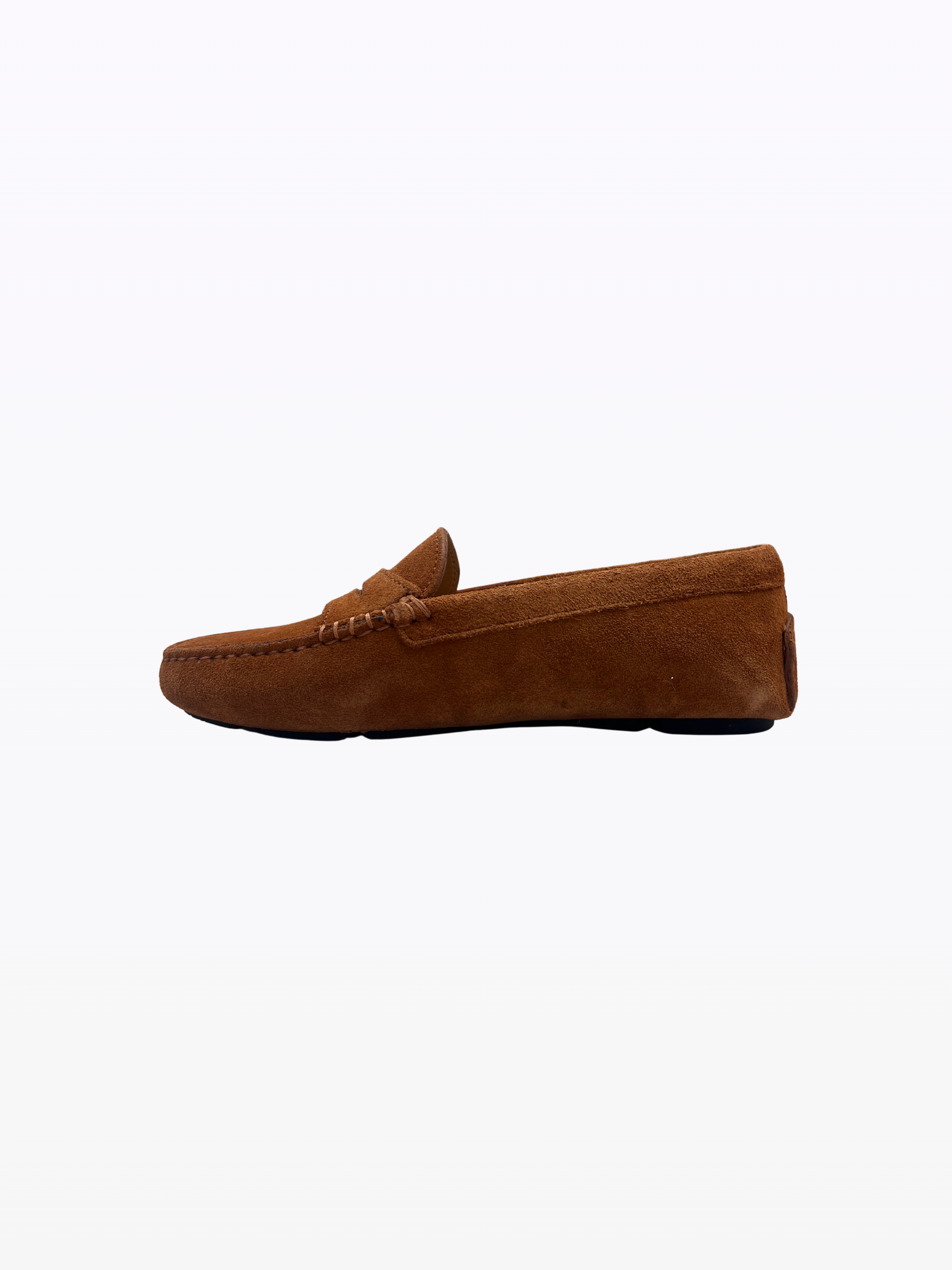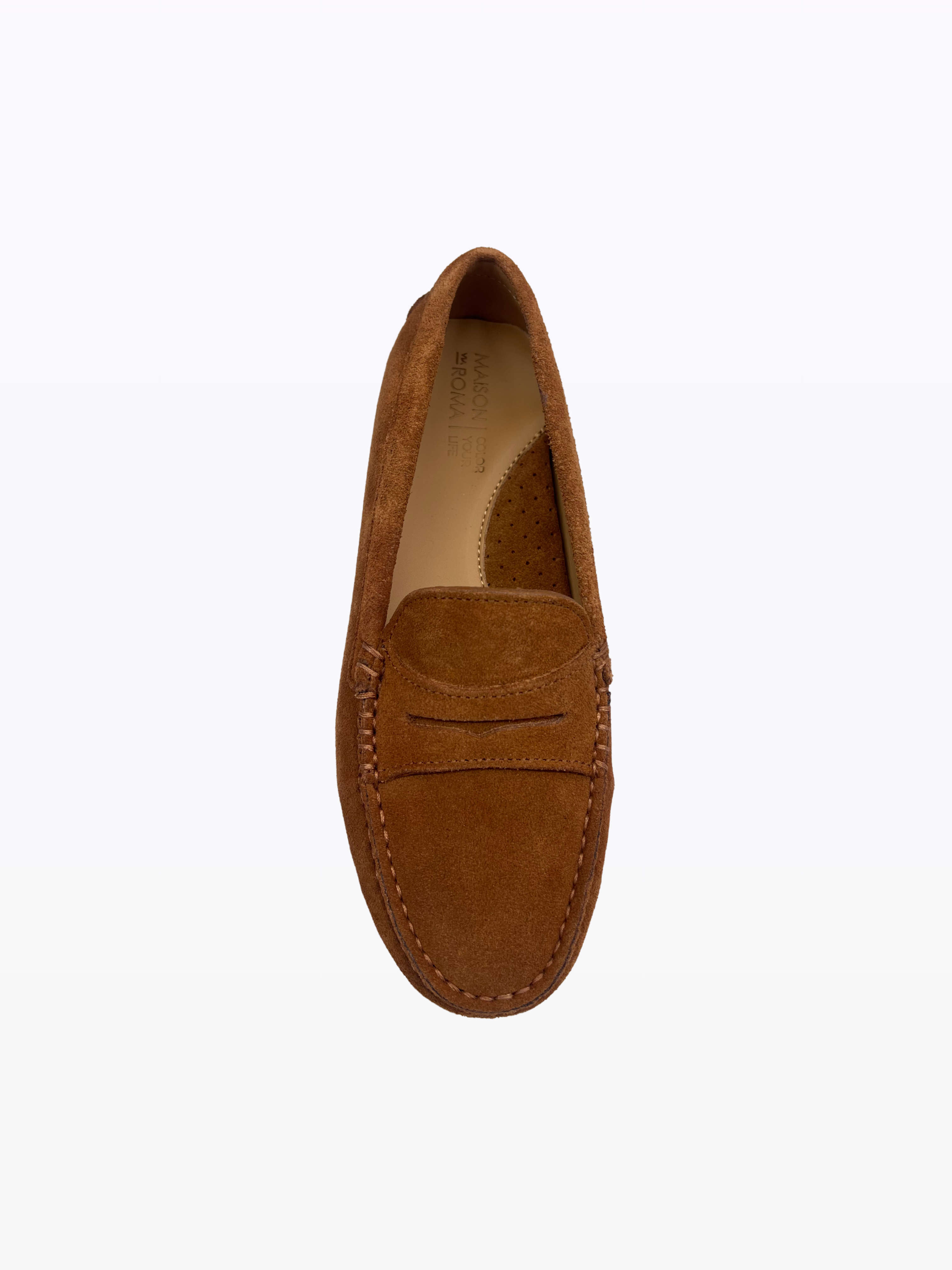 Moccasin carshoes with rubber sole and inner heel for a camber of 2 cm. Ideal for preventing back pain from shoes that are too flat. Italian rain-resistant suede calfskin, leather lining. Suitable for all body types and sensitive feet.