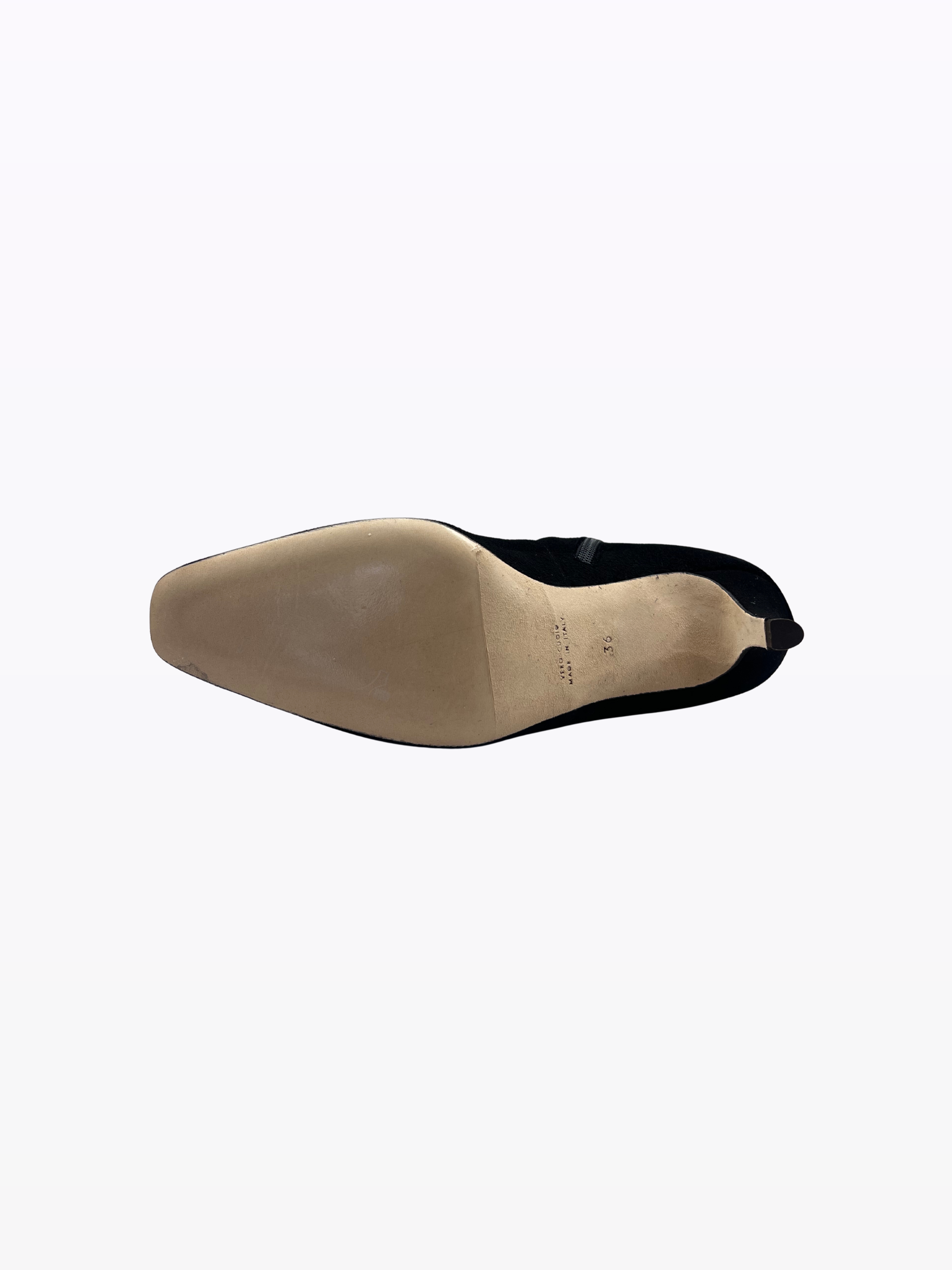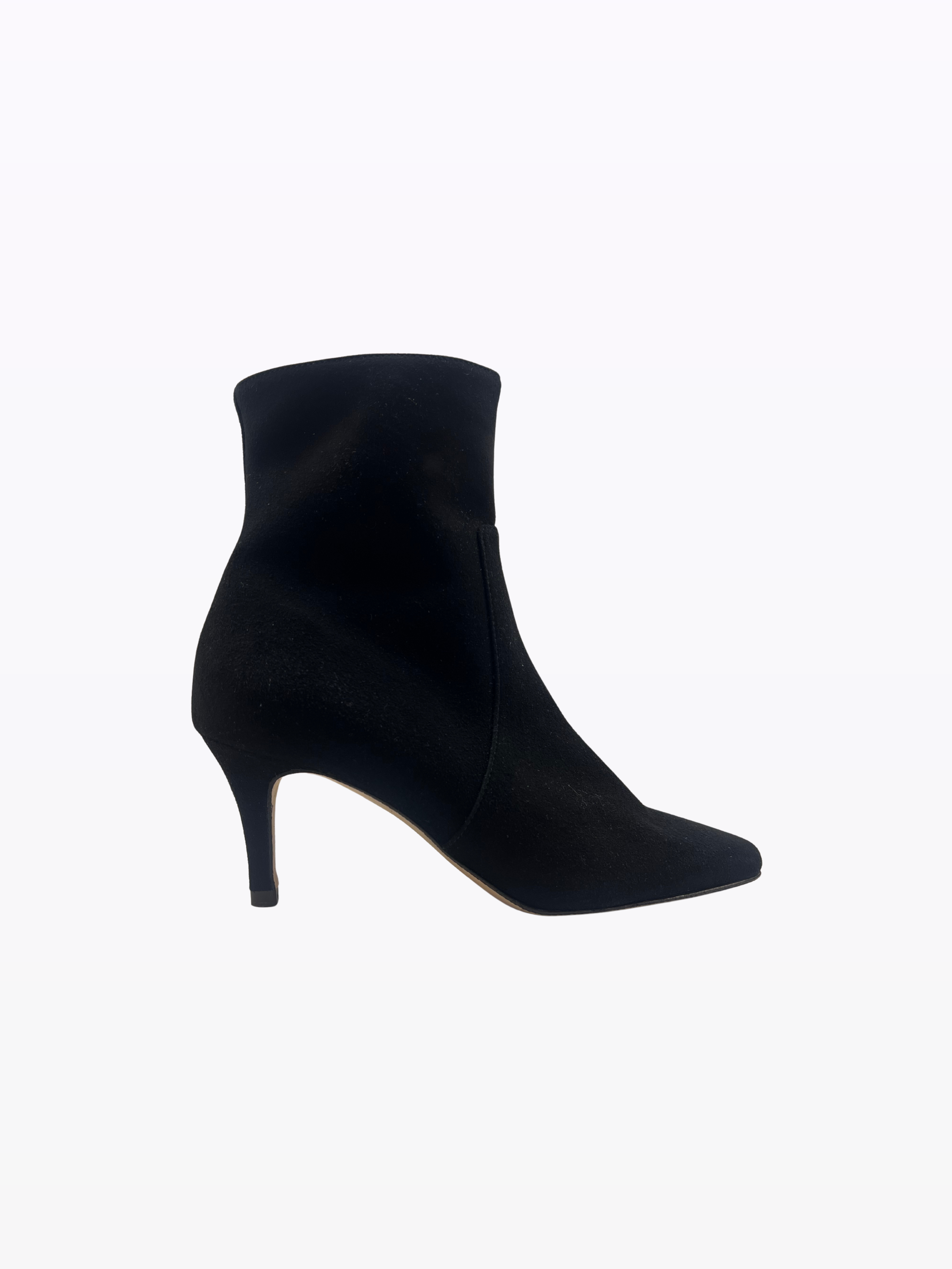Italian suede heeled ankle boots. Leather lining and sole. 7 heel. Internal zipper.