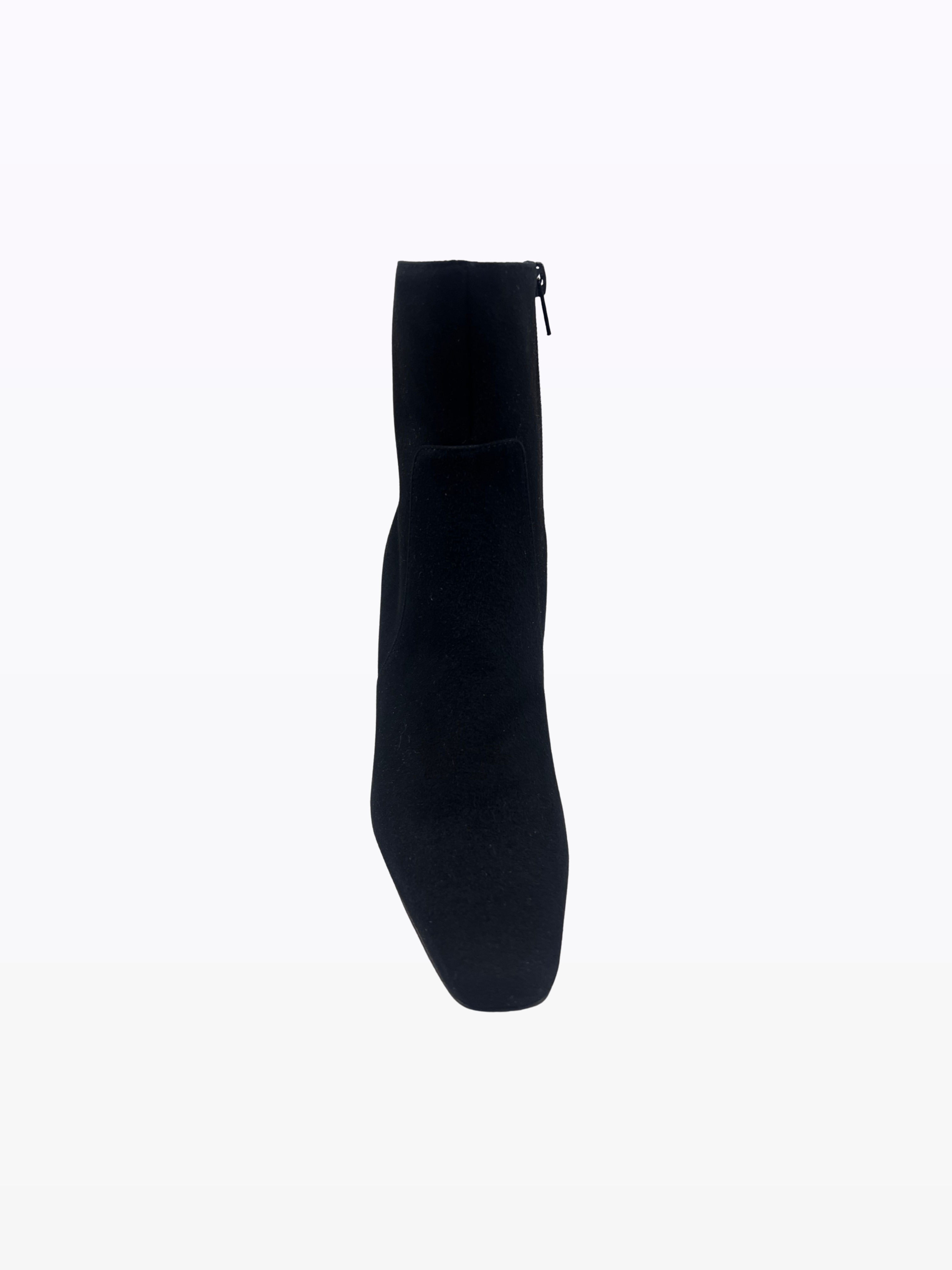 Bottines à talon en daim italien. Doublure et semelle en cuir. Talon de 7 cm. Zip interne.