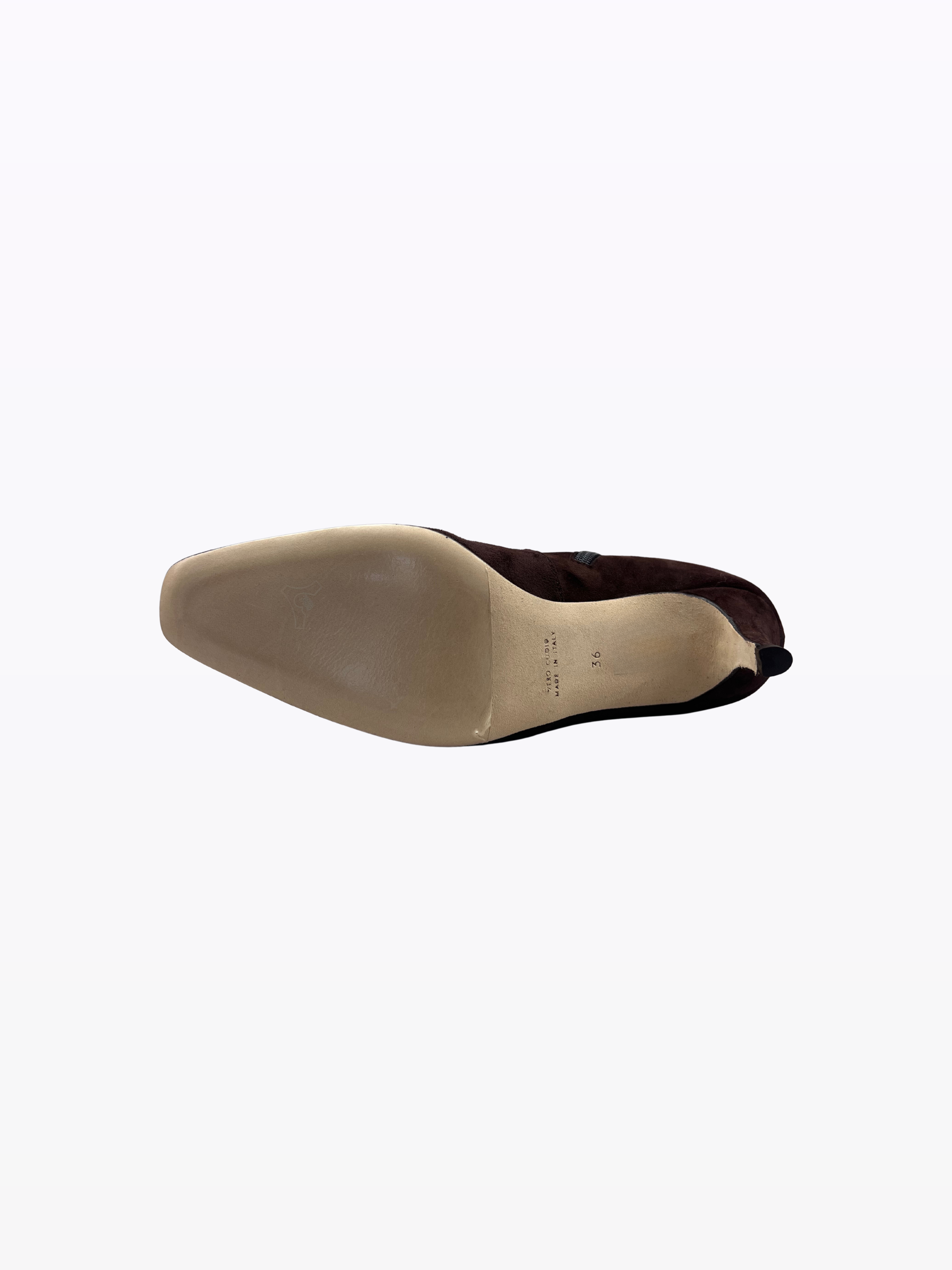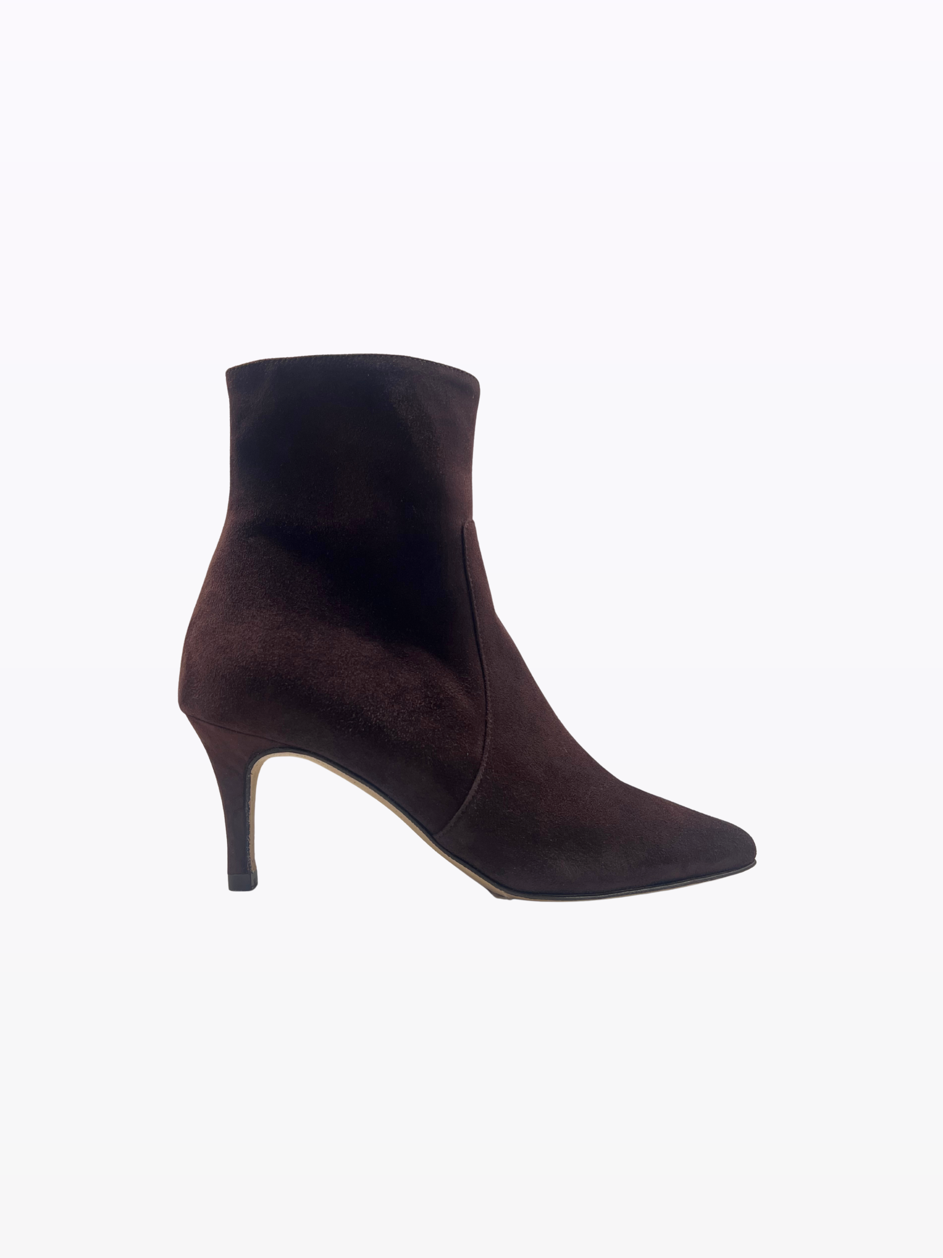 Italian suede heeled ankle boots. Leather lining and sole. 7 heel. Internal zipper.