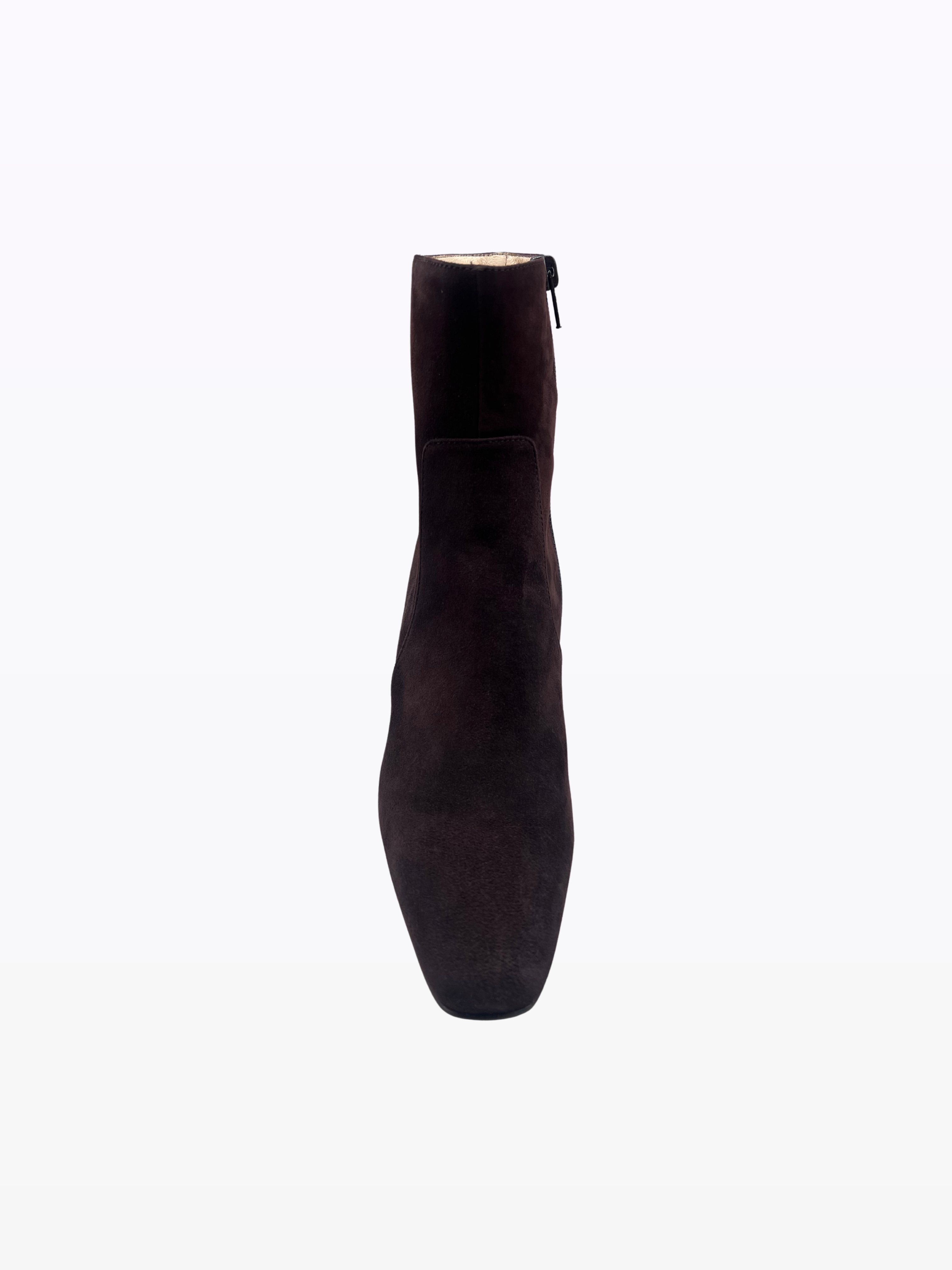 Bottines à talon en daim italien. Doublure et semelle en cuir. Talon de 7 cm. Zip interne.