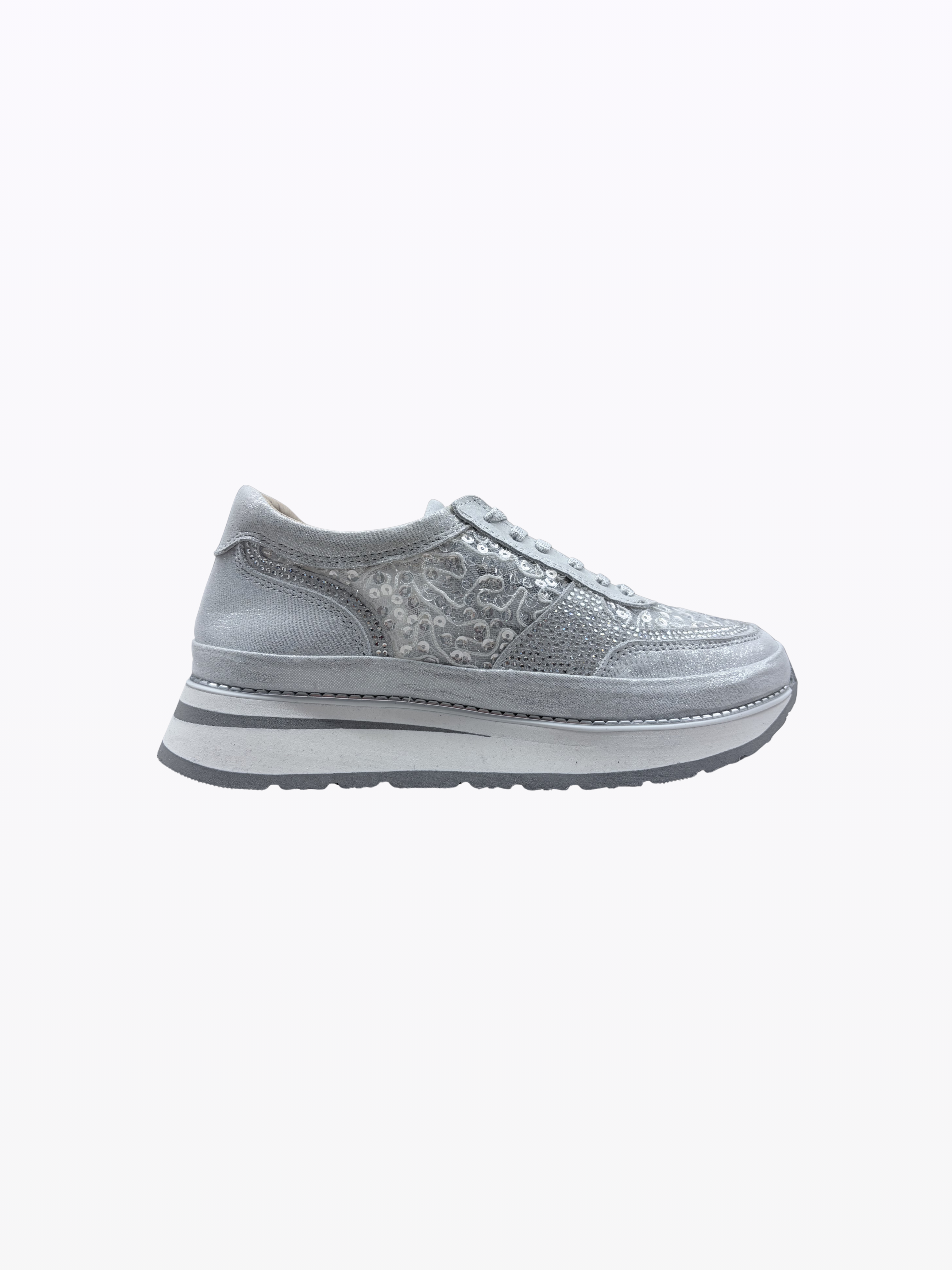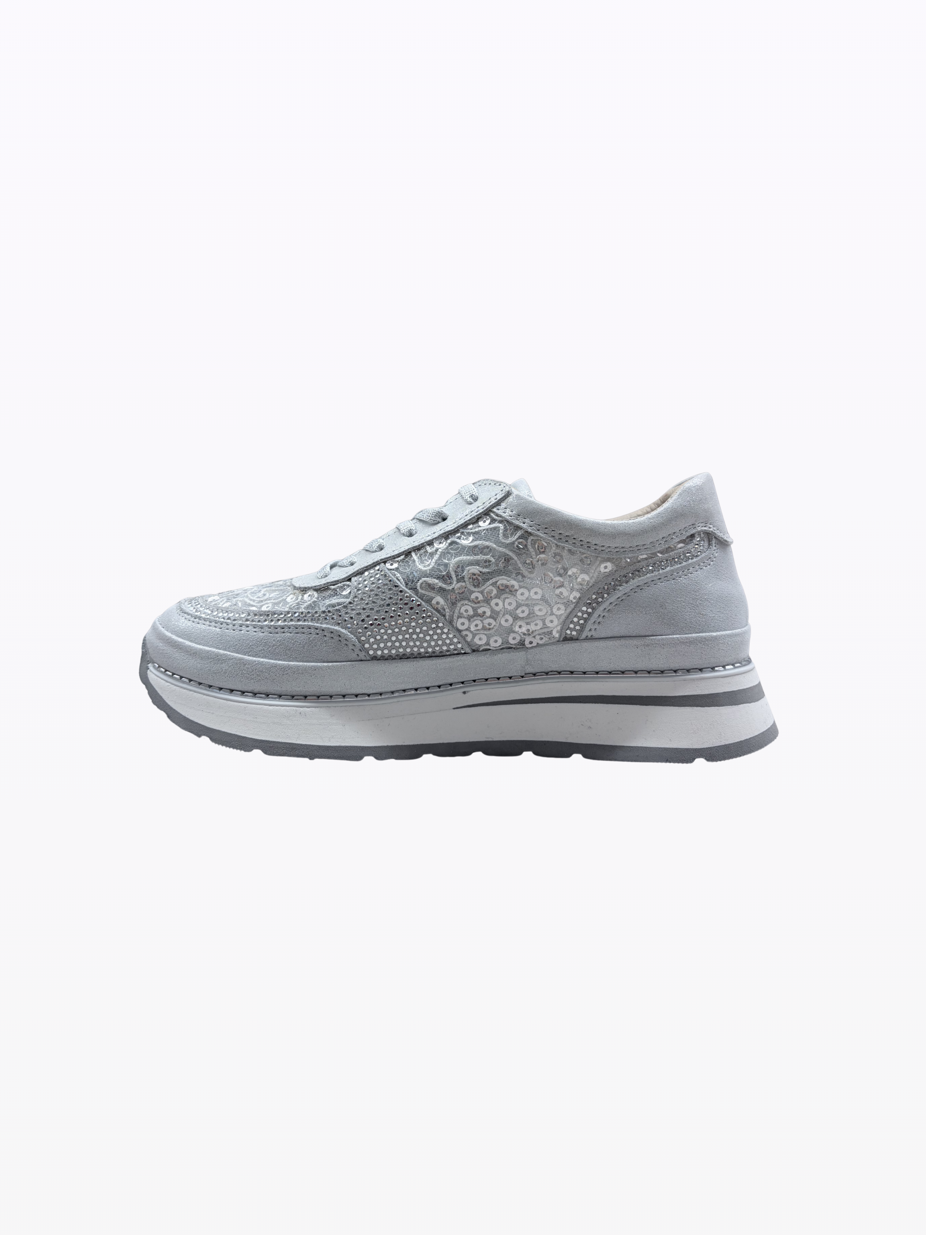 Basket en daim et tissu italien. Doublure en tissu et cuir. Semelle interne amovible et semelle externe en gomme. Talon de 3 cm. Ultra légère et confortable, convient à toutes les morphologies.