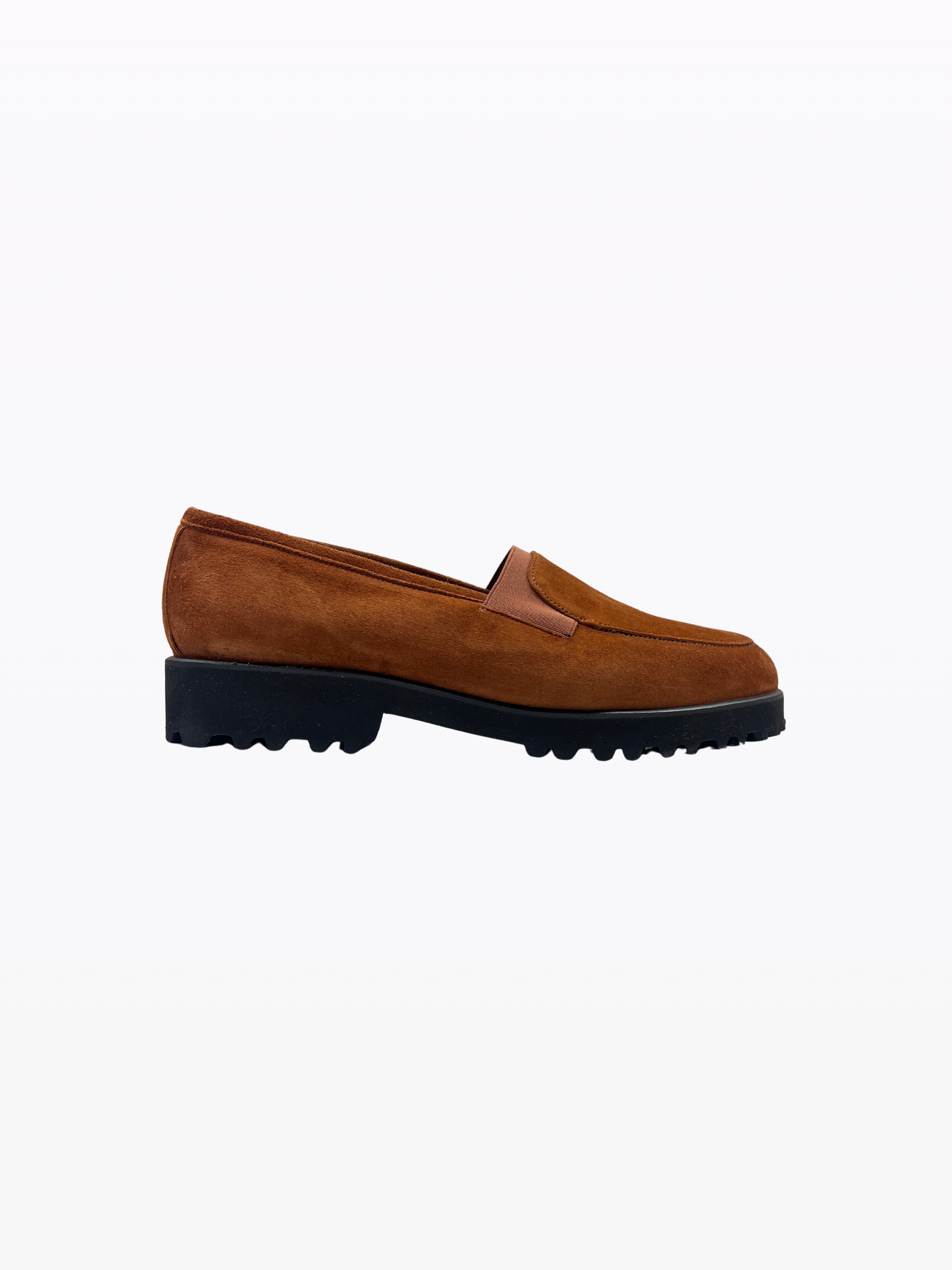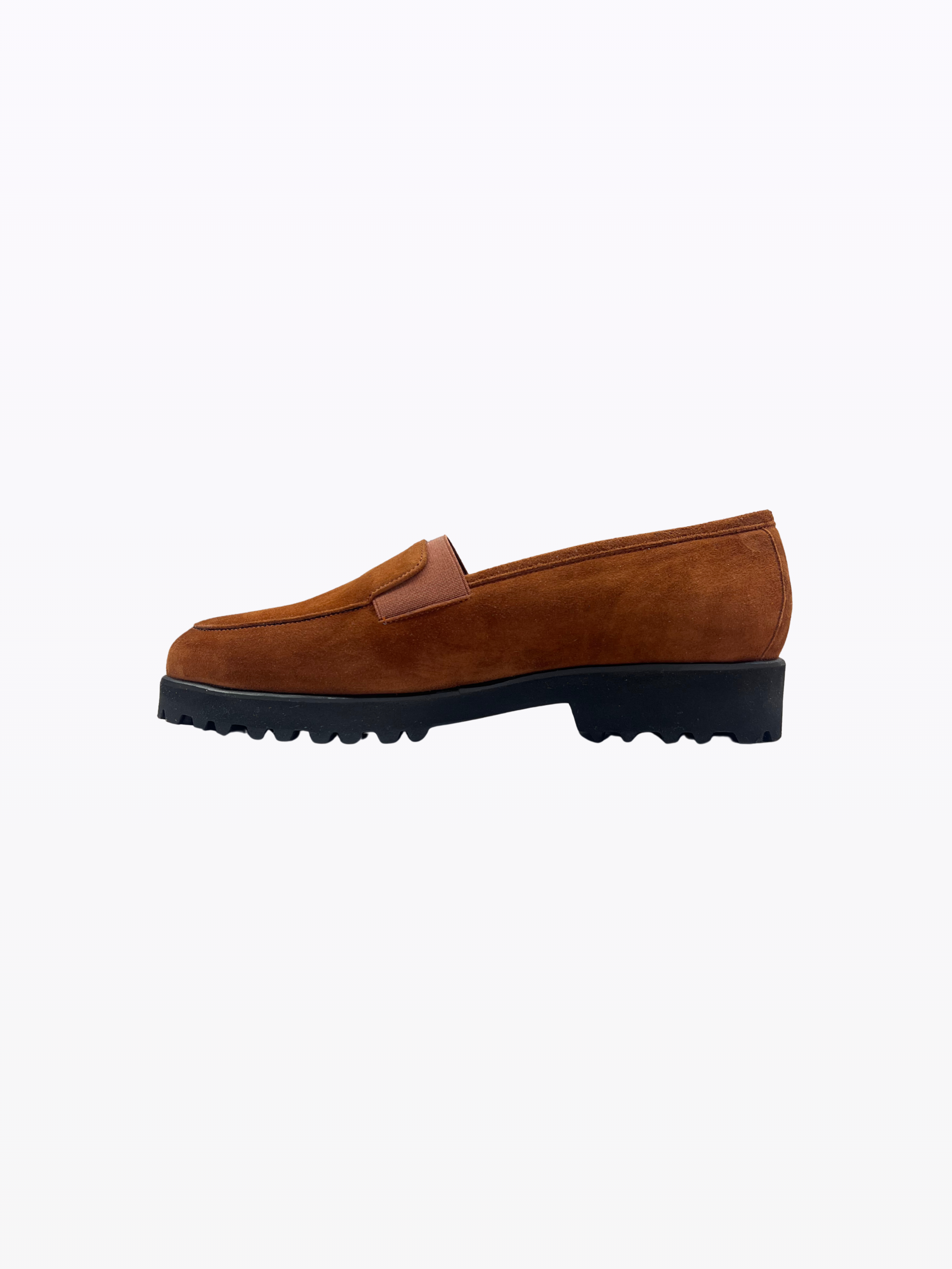 Moccasin in italian suede with elastic. 2 cm heel and lightweight sole. Leather lining. Very comfortable and easy to put on. Water-repellent and treated against stains. Suitable for all feet types.