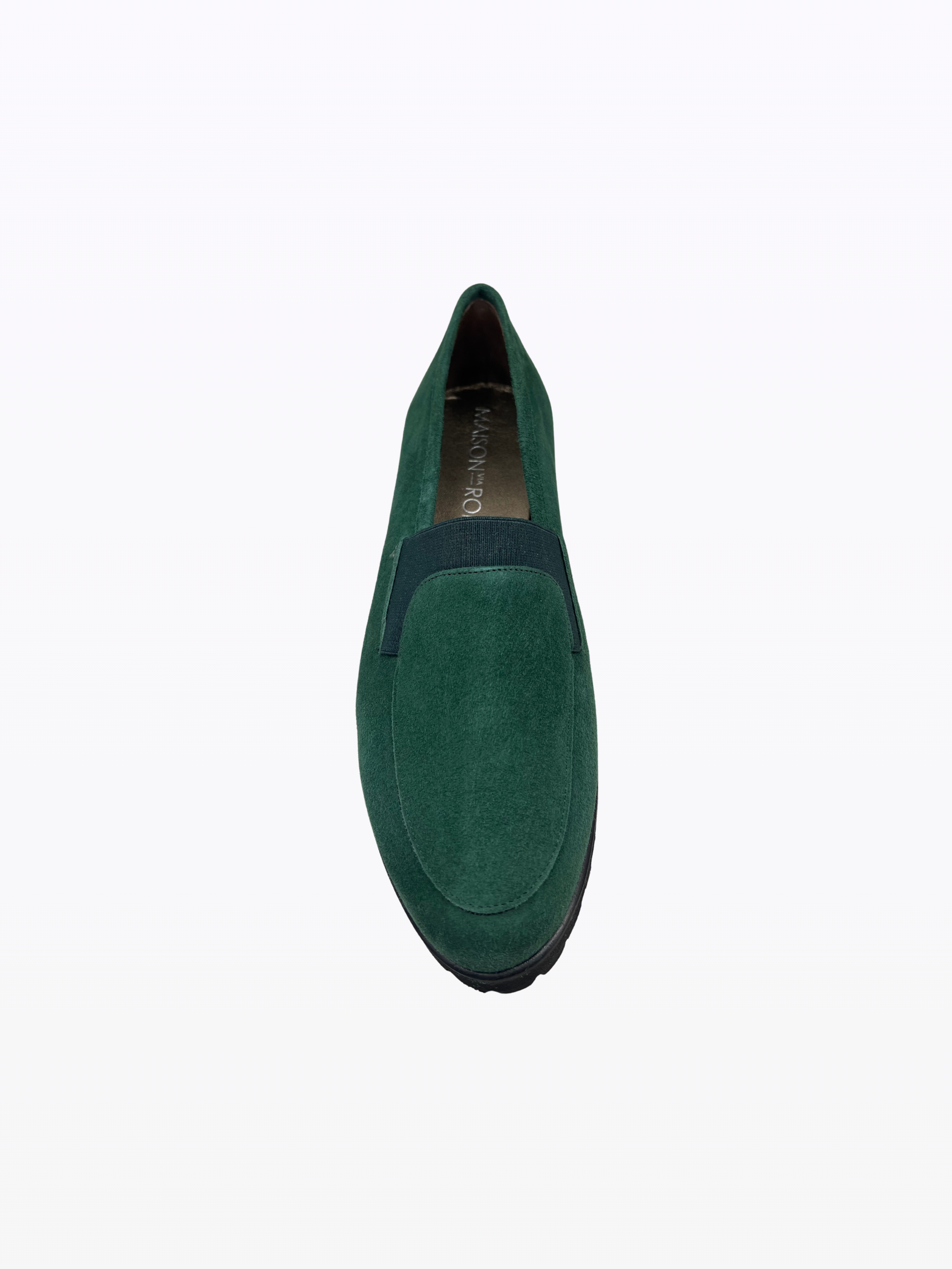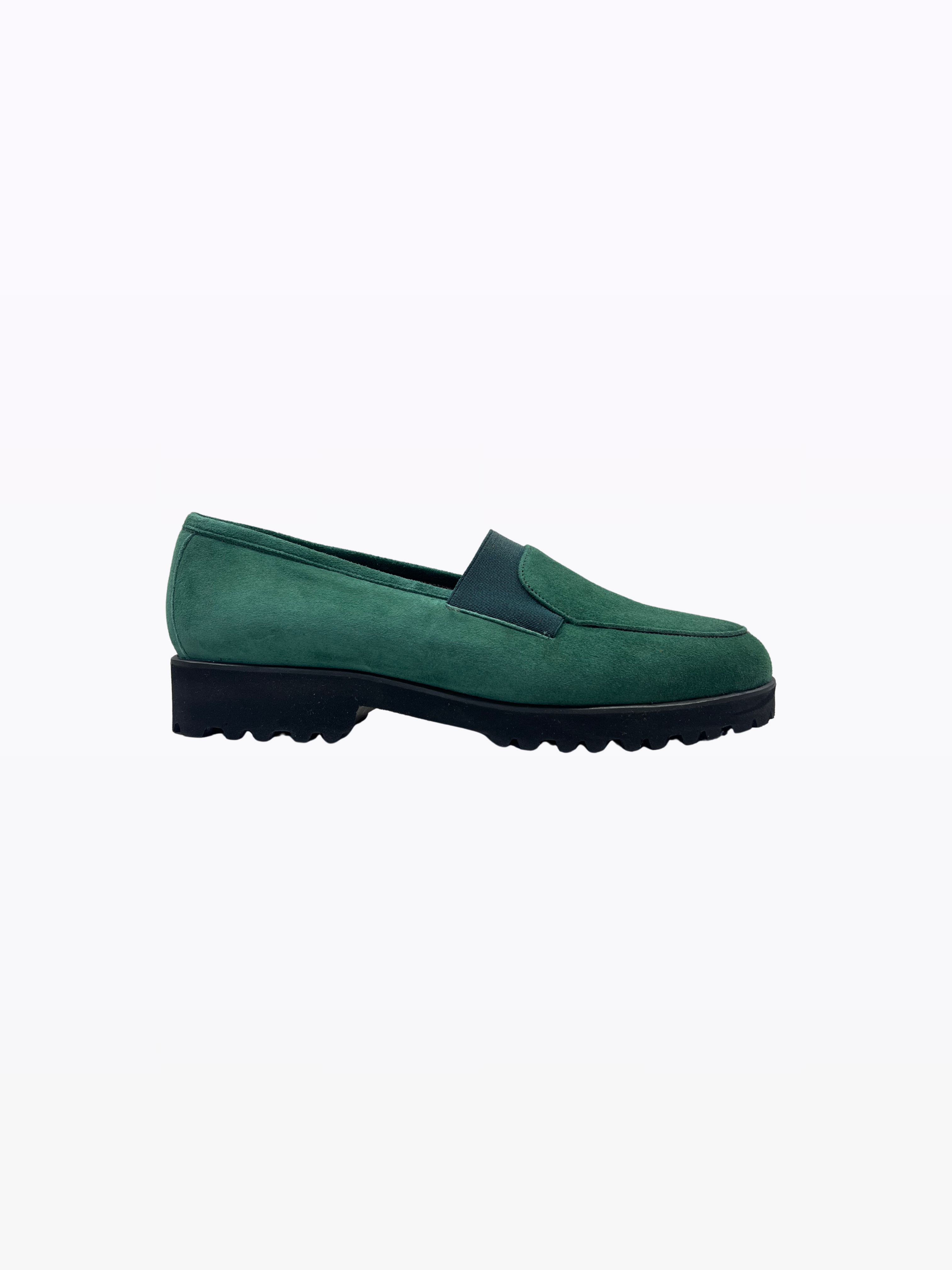 Moccasin in italian suede with elastic. 2 cm heel and lightweight sole. Leather lining. Very comfortable and easy to put on. Water-repellent and treated against stains. Suitable for all feet types.
