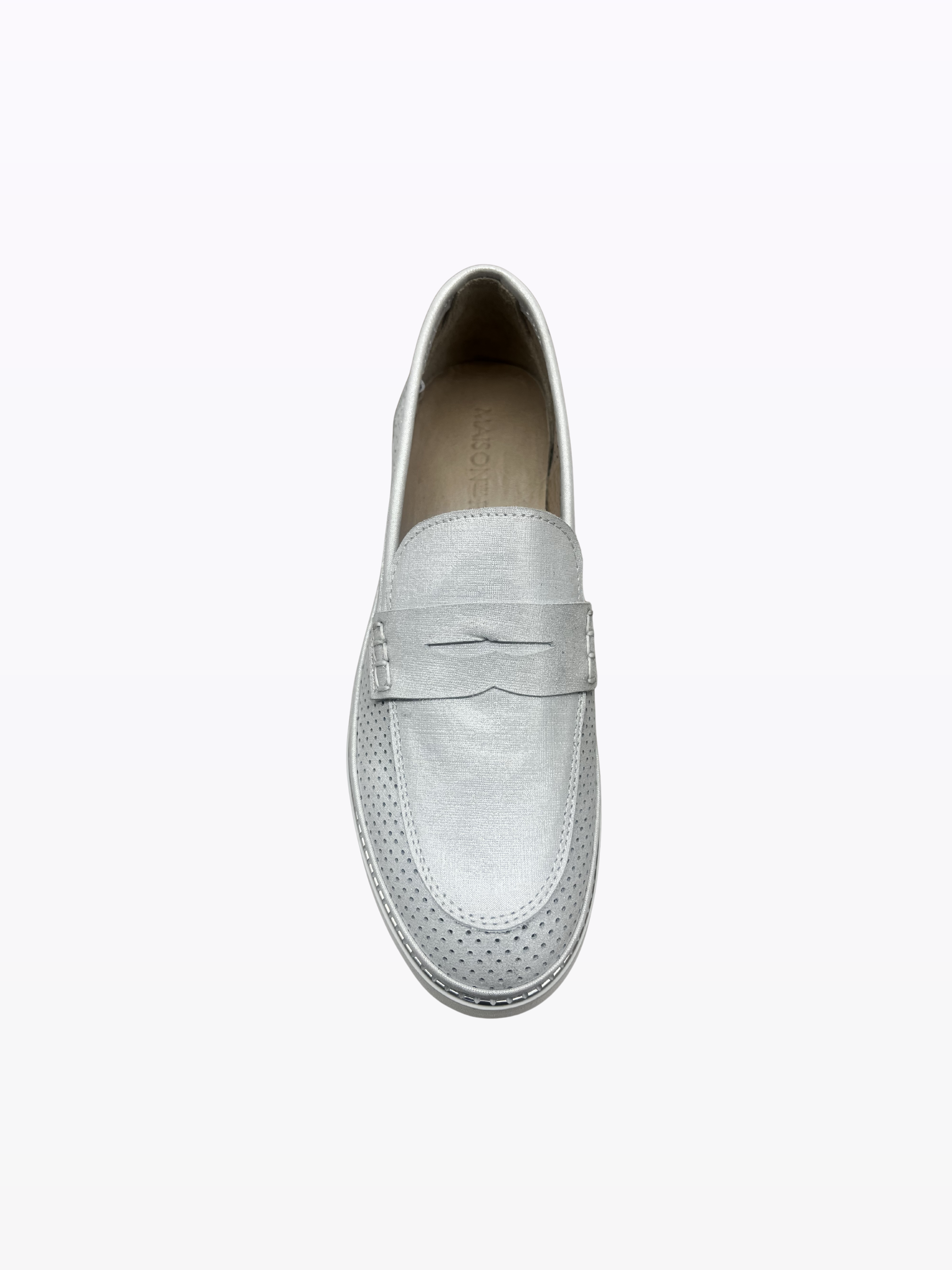 Mocassin en daim italien perforé et souple. Doublure en cuir, semelle interne amovible. Talon de 2,5 cm. Semelle externe en gomme anti-glisse et isolante. Confortables et idéales pour les pieds sensibles.